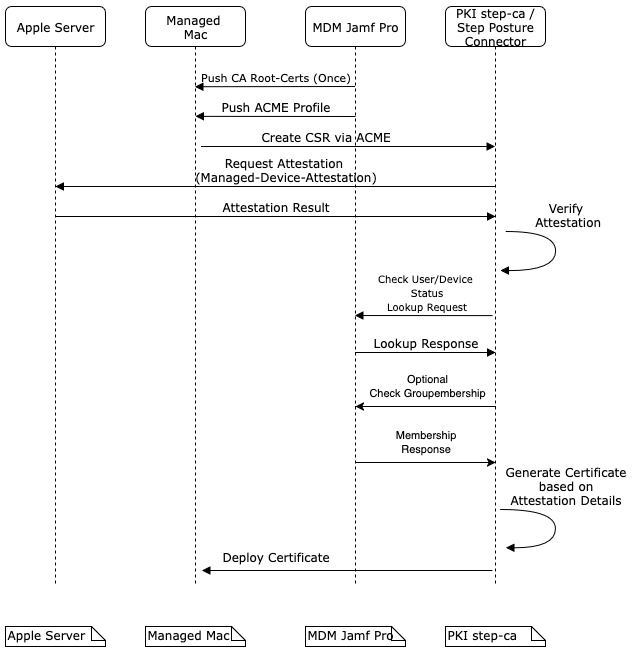 Our options for free, open source and locally deployable CA’s are quite limited, also the support for Managed-Device-Attestation (MDA) from Apple was desired. This led us to smallstep’s step-ca in conjunction with the Step Posture Connector and ACME as the protocol that supports MDA.