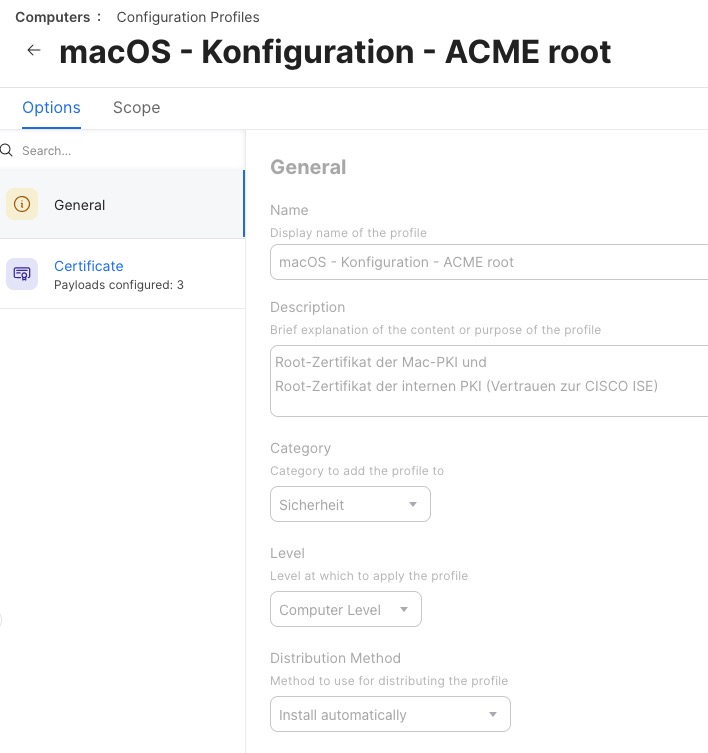 Now to the fun part. Create a Jamf configuration profile that contains your Root- and Intermediate Certificates (and also the certificate the network infrastructure uses), so the Macs trust your newly created CA.