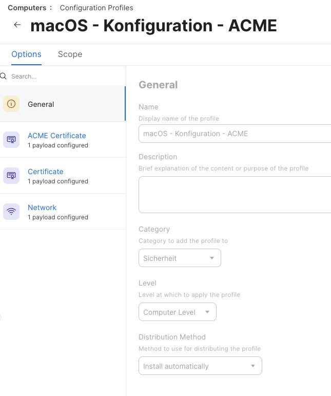 The real fun starts now. Create a Jamf configuration profile with the ACME Payload, the certificate the network infrastructure uses and network configuration payload, all in one profile.