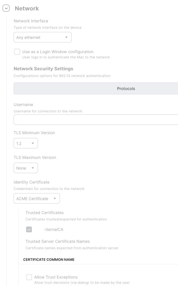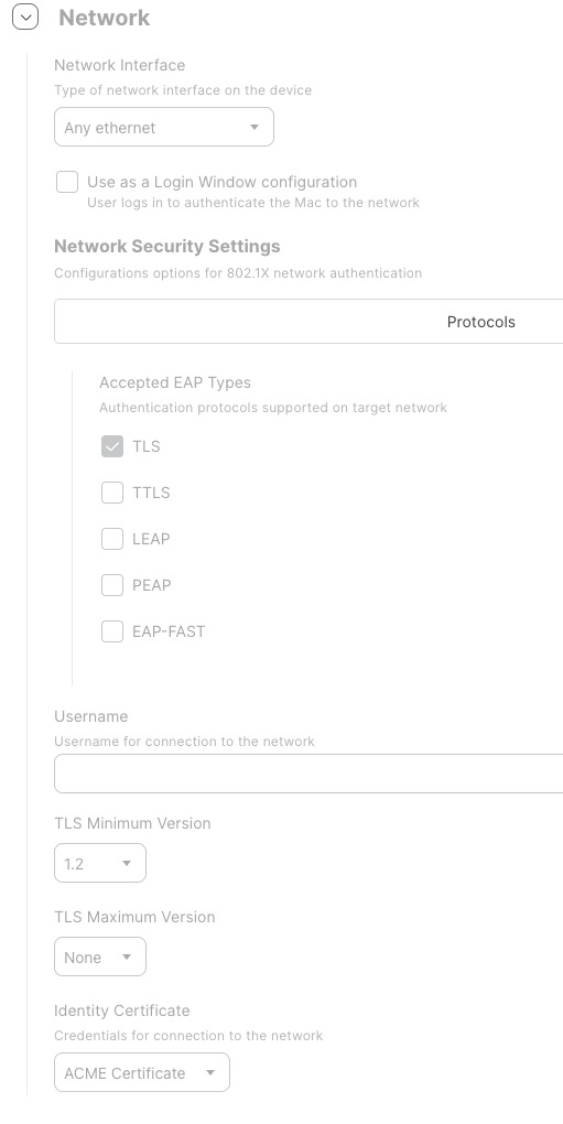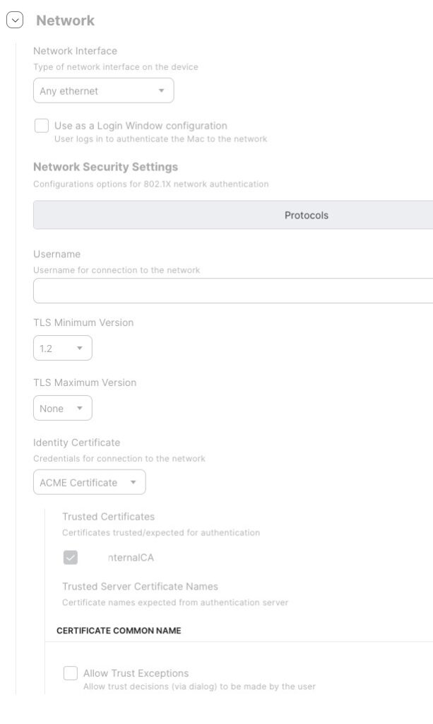 The Network payload uses the just configured ACME certificate and also the additional certificate for trusting our Cisco ISE. We use EAP-TLS.
