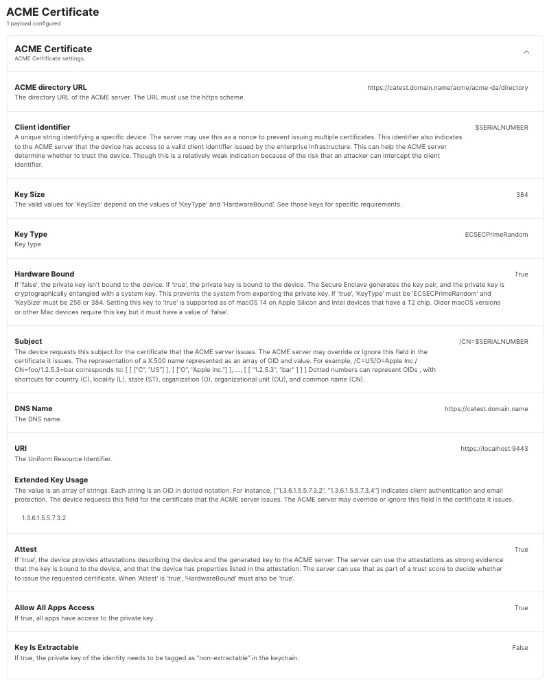 Let’s take a look at the details. The ACME payload sets the step-ca server, the encryption details, and enables attestation via MDA. The certificate’s Common Name (CN) is set to the serial number of the Mac, so we use the variable $SERIALNUMBER twice.